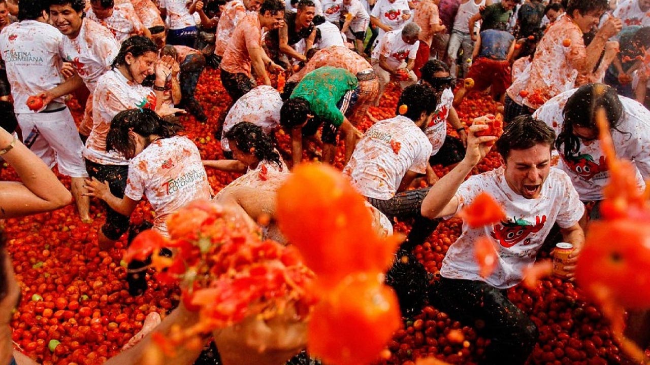 يُقام مهرجان لا توماتينا في بلدة بونيول الإسبانية سنويًا، حيث يتجمع آلاف الأشخاص لرشق بعضهم البعض بالطماطم الناضجة! بدأ هذا التقليد في أربعينيات القرن الماضي وأصبح واحدًا من أشهر المهرجانات الفوضوية في العالم. الهدف؟ مجرد المرح وإغراق الشوارع بعصير الطماطم!