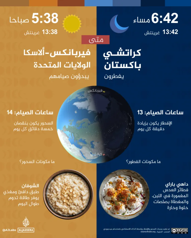 على سبيل المثال، في مدينة راجشاهي البنغلاديشية، حيث يعيش أكثر من مليون نسمة، يرفع أذان الفجر إيذانًا ببداية يوم جديد من الصيام، بينما في الجهة المقابلة من الأرض، تغيب الشمس خلف الأفق في نيويورك، حيث تتحلق العائلات حول موائد الإفطار بعد يوم صيام دام 13 ساعة.