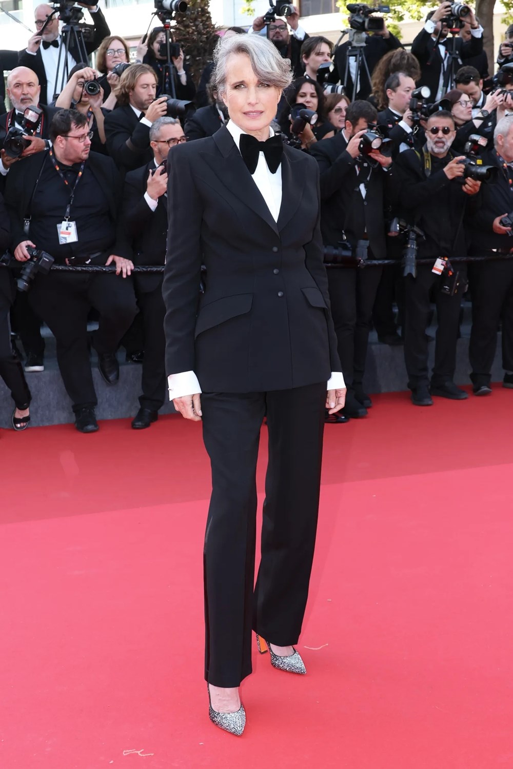 في خيار كلاسيكي غير متوقع، ارتدت النجمة الأميركية بدلة سوداء مع قميص أبيض وربطة عنق بسيطة، وأضافت لمسة عصرية بحذاء فضي ميتاليك. اللوك كان بسيطًا ومميزًا في آنٍ واحد، وجسد الأناقة المتمردة بأسلوب ناعم.