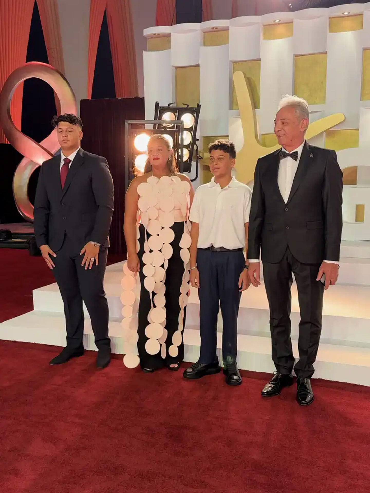 أما الفنان حسين فهمي، فقد حضر برفقة زوجته التي اختارت فستانًا أنيقًا بلون بيج هادئ، بينما ظهر النجم الكبير محمود حميدة في لحظة مؤثرة بصحبة أحفاده على السجادة الحمراء، حيث التقط معهم صورًا جذبت عدسات المصورين.