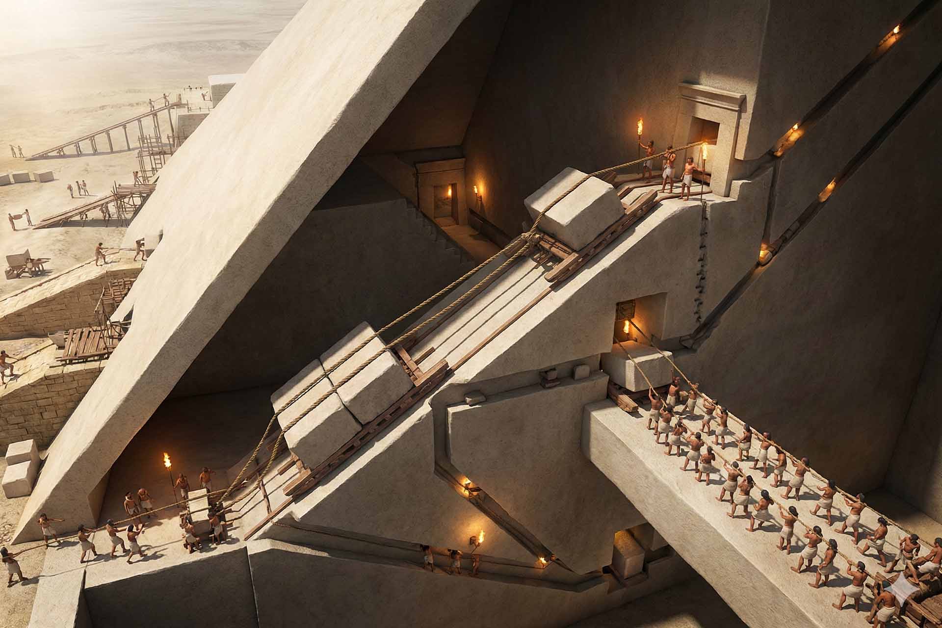 اعتمد علماء الآثار لفترات طويلة على فرضية المنحدرات الخارجية الطويلة لرفع الحجارة طبقة تلو الأخرى. لكن هذه الفرضية تواجه معضلة كبرى؛ فهي تتطلب جهداً ووقتاً هائلين لا يتناسبان مع سرعة الإنجاز التاريخية للهرم.