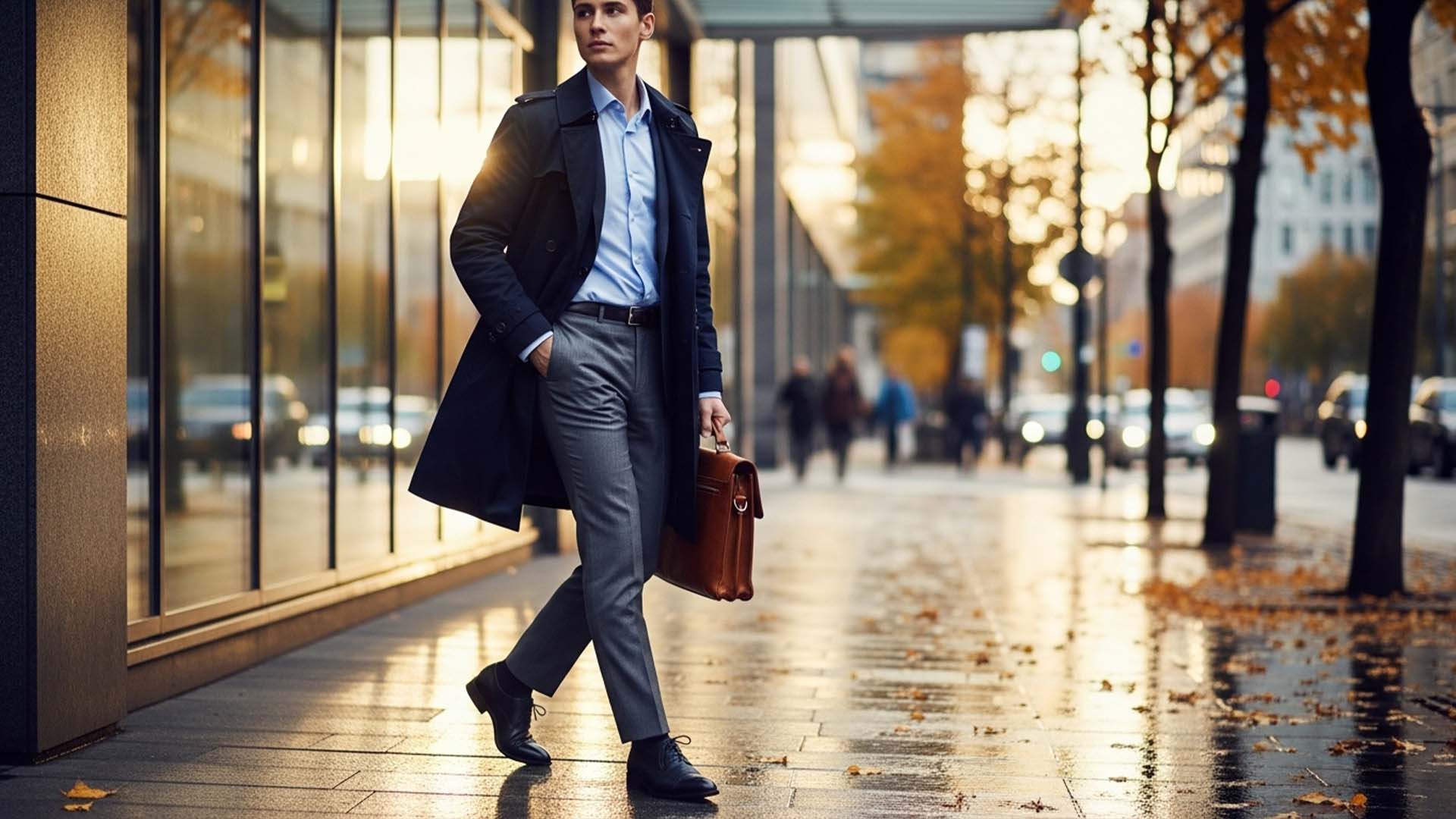 عمل أنيق: ترنش كحلي + بنطال قماشي رمادي + قميص أزرق فاتح + أوكسفورد.