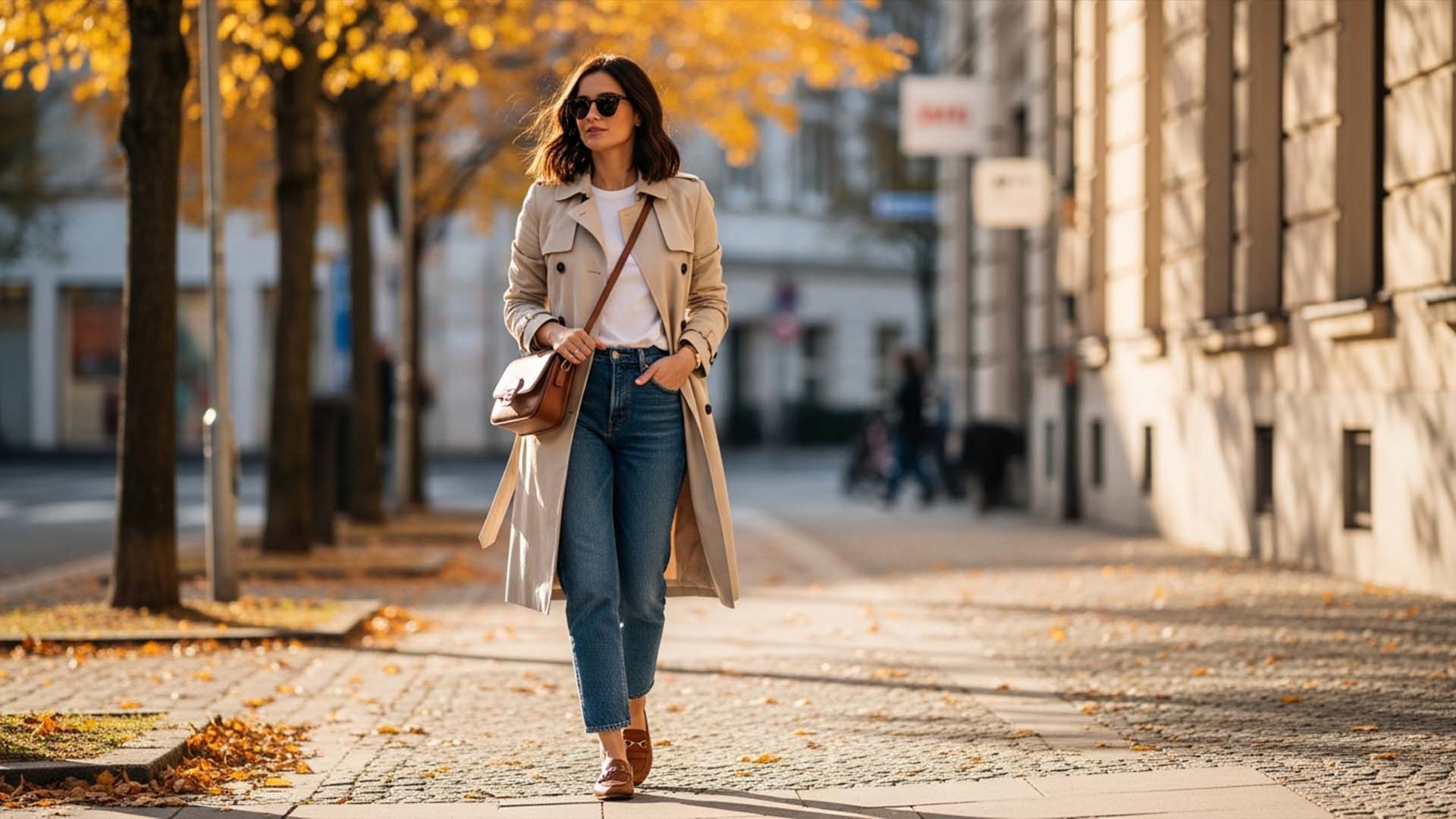 كاجوال ذكي (نهاري): ترنش بيج + جينز أزرق مستقيم + تي-شيرت أبيض + لوفر.