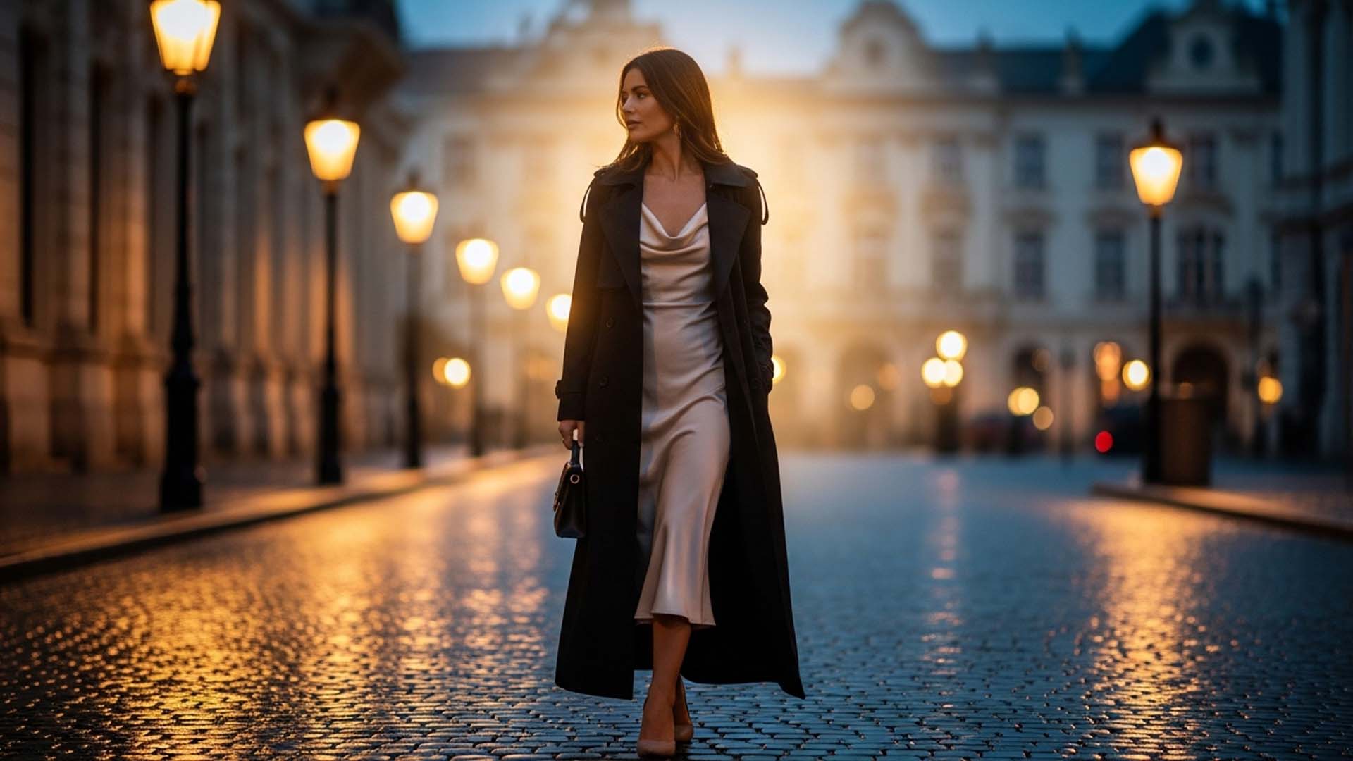 مسائي بسيط: ترنش أسود طويل + فستان ساتان ميدي + حذاء بكعب متوسط + حقيبة كلاتش.